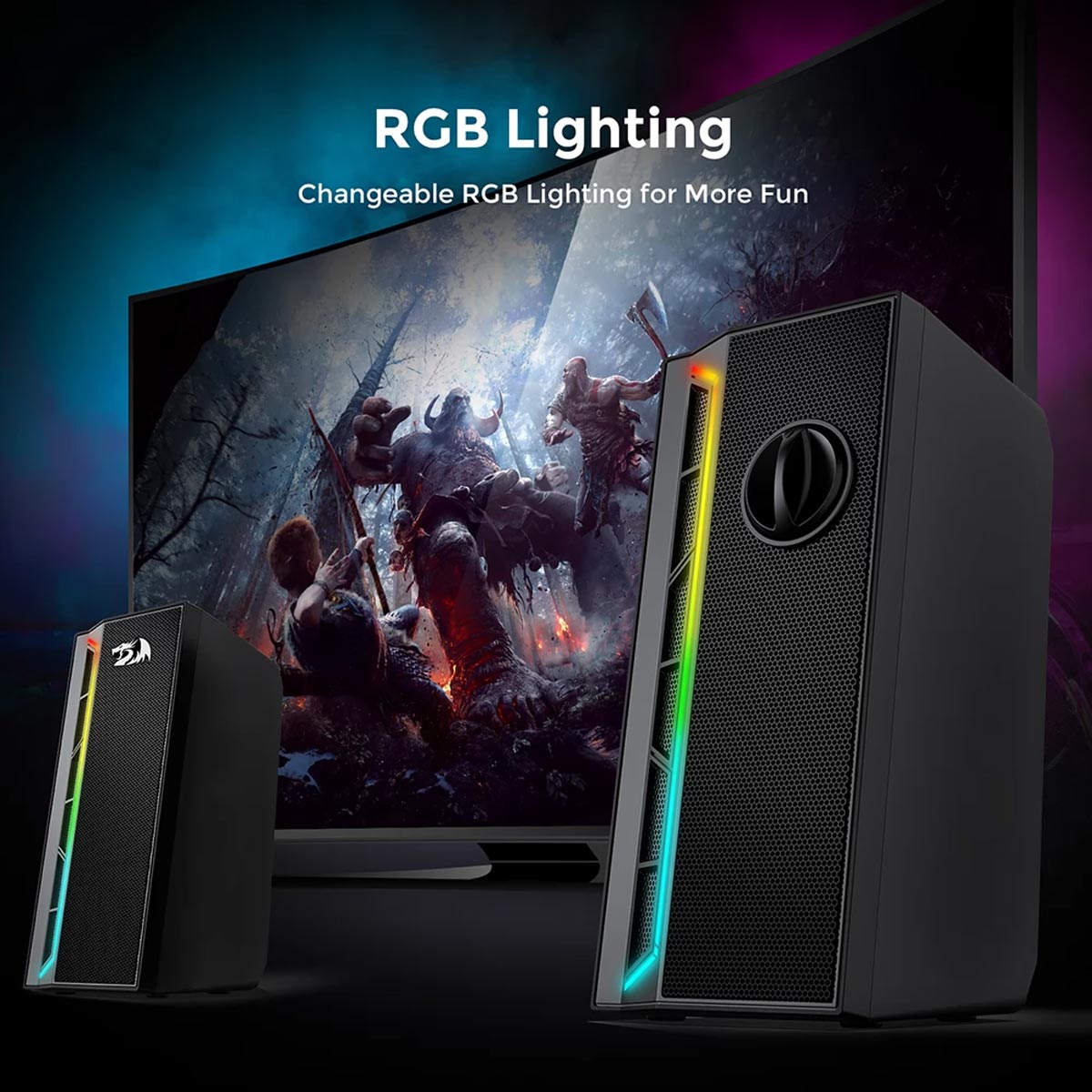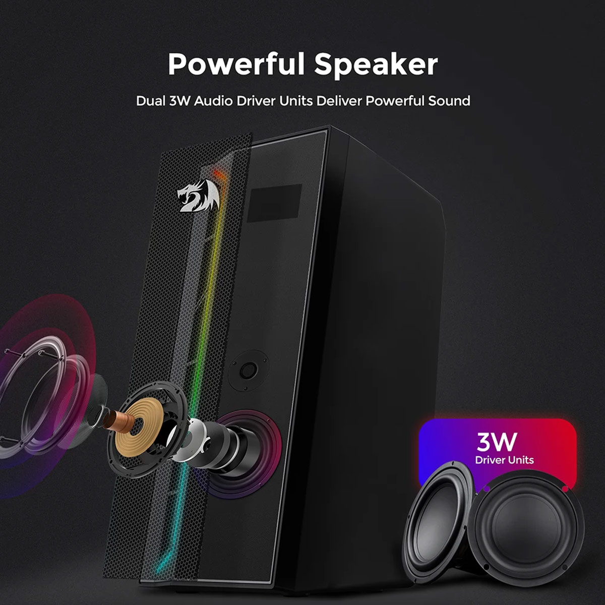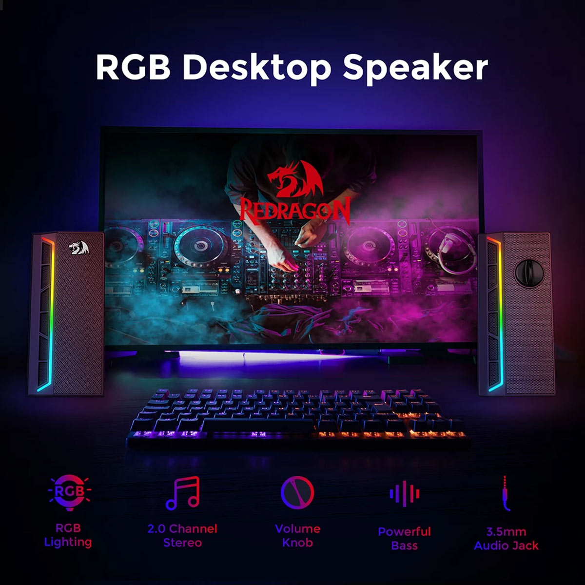 REDRAGON CALLIOPE GS580 8W X 2 STEREO SPEAKERS BLUETOOTH 5.0 FM RADIO USB AUX IN 3.5MM AUDIO CABLE VOLUME CONTROL PORTABLE HANDLE RGB LIGHTING 2.0 CHANNEL GAMING SPEAKER - BLACK