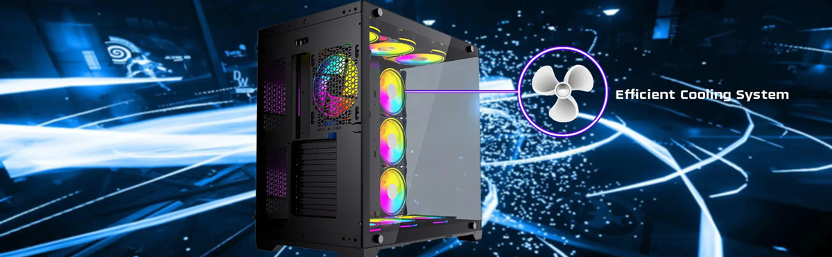 Tempered Glass Design: Showcase panel highlights components and RGB lighting.