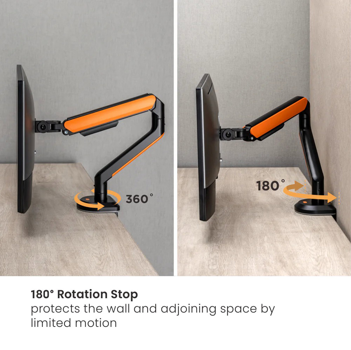designed for controlled movement, the 180° rotation stop prevents the monitor arm from