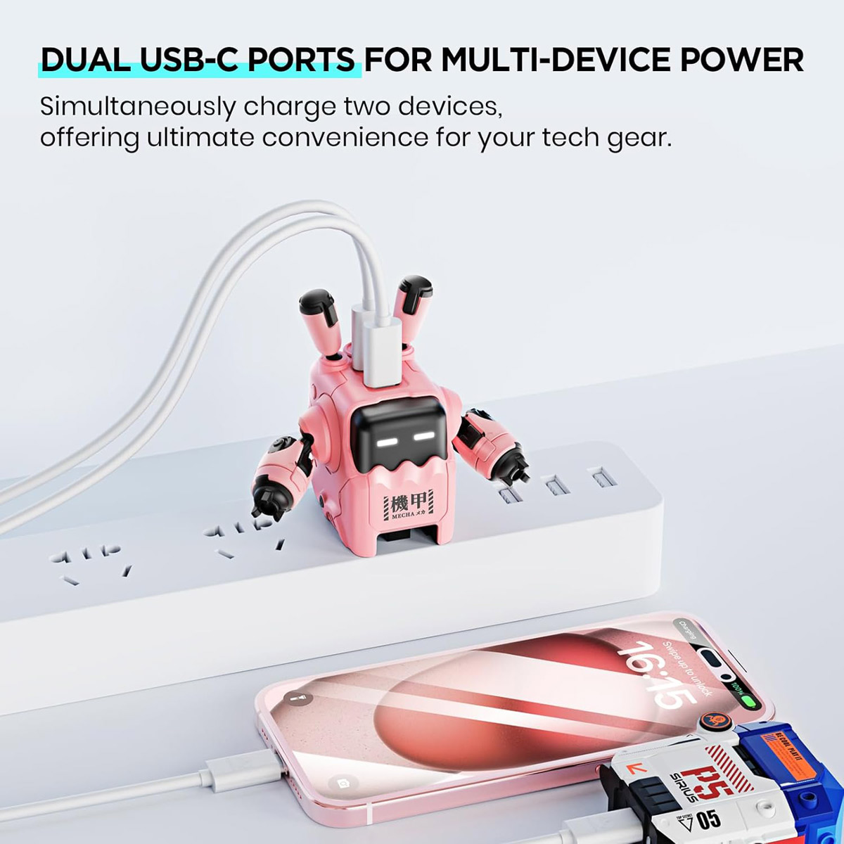 Mecha-Inspired Design: Movable arms, rotatable ears, and blinking eyes make charging fun and expressive.