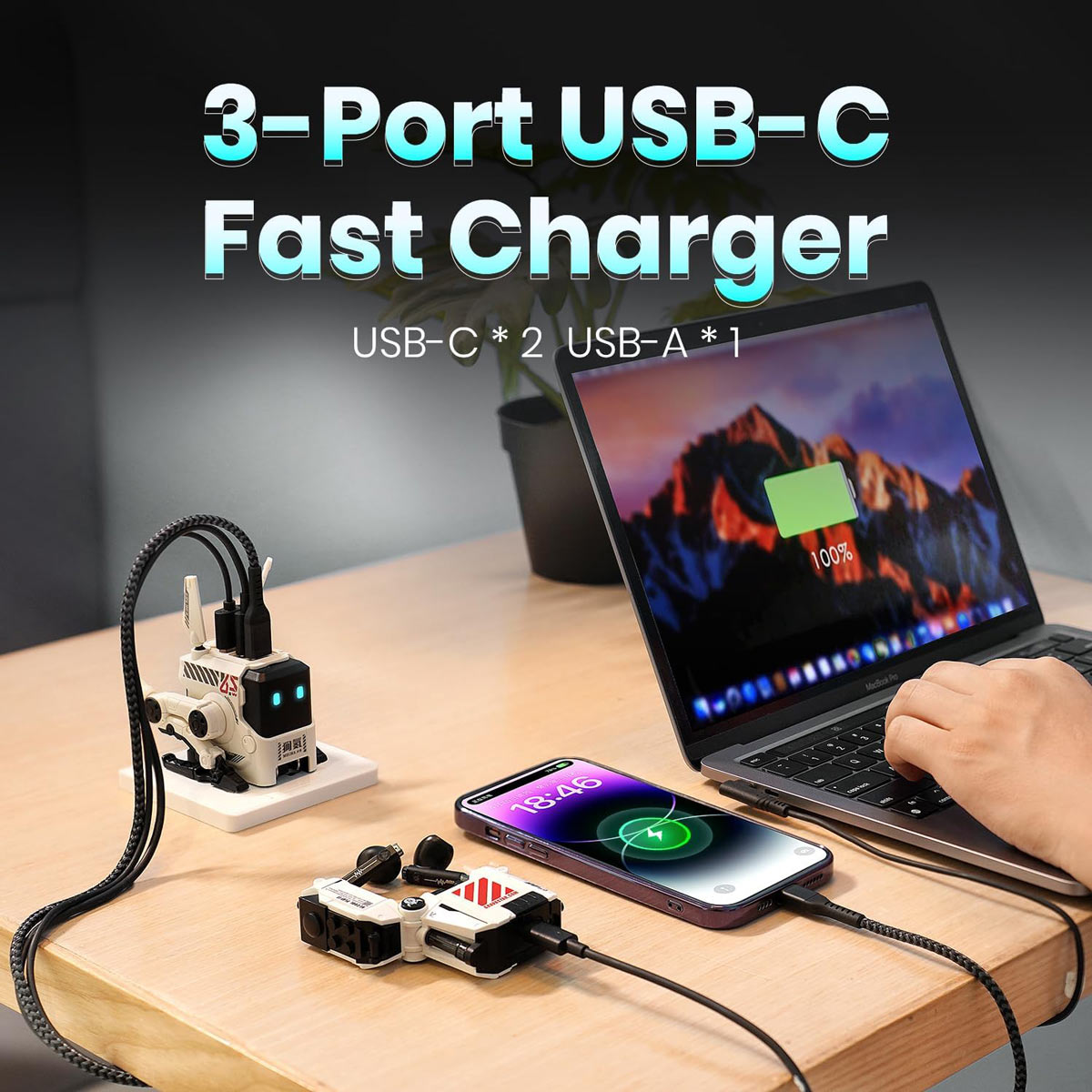 65W GaN Fast Charging: Charge a MacBook Air to 51% in just 30 minutes via the USB-C port.
