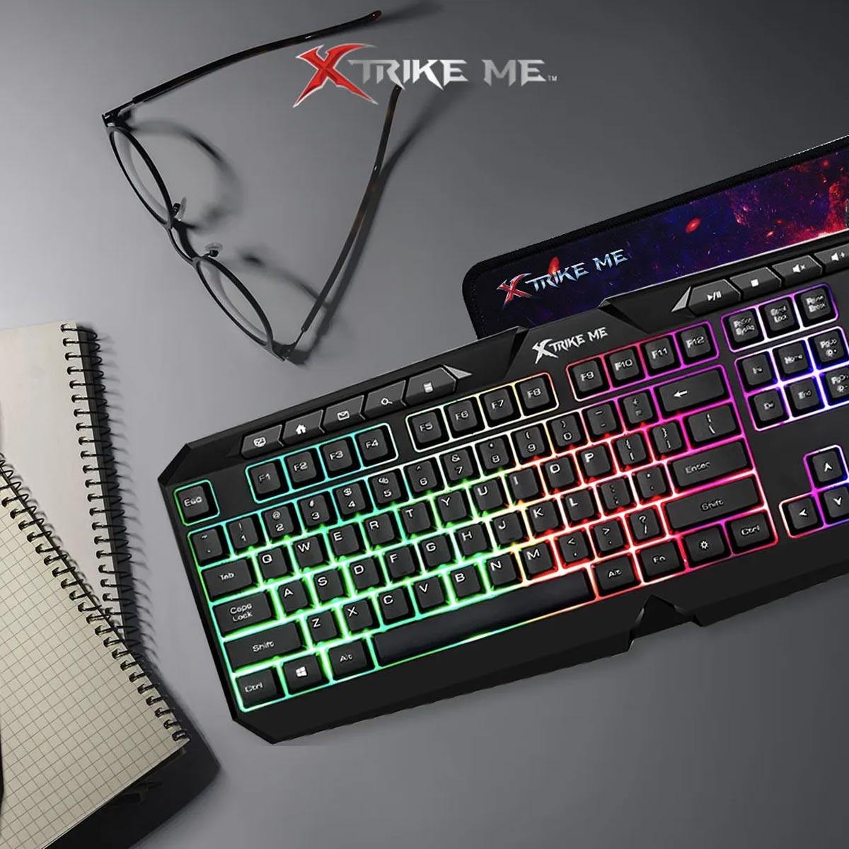 Keyboard: Full-size membrane design with 114 keys, 10 multimedia shortcuts, and rainbow backlighting.